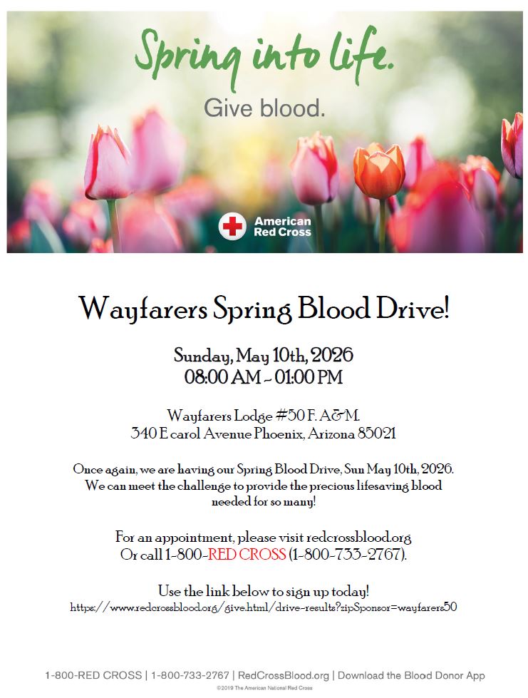 To schedule your appointment, please call 1-800-RED-CROSS (1-800-733-2767). Visit the following link online to register as a donor as well: redcrossblood.org use the Sponsor Code: Wayfarers50